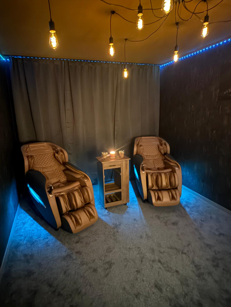 Genieße eine entspannende Massage in unserem luxuriösen Massagesessel — der perfekte Zusatz zu deiner Behandlung. Lass dich fallen und komm zur Ruhe.